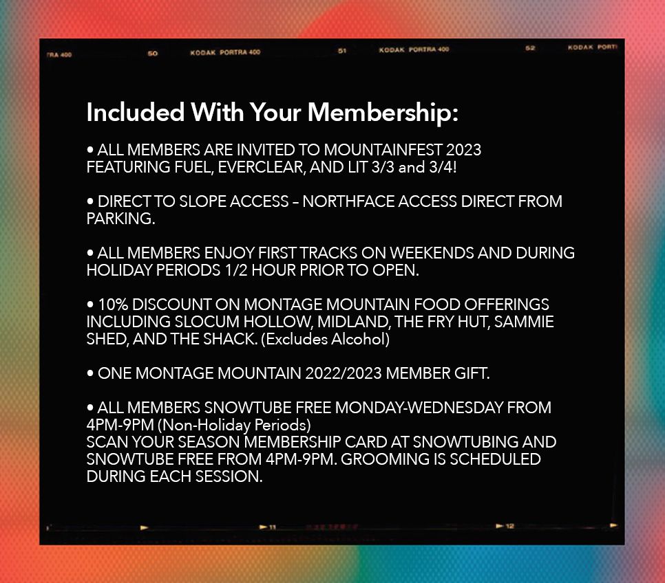 Included With Your Membership 1. DIRECT TO SLOPE ACCESS – NORTHFACE ACCESS DIRECT FROM PARKING. 2. ALL MEMBERS ENJOY FIRST TRACKS ON WEEKENDS AND DURING HOLIDAY PERIODS 1/2 HOUR PRIOR TO OPEN. 3. 10% DISCOUNT ON MONTAGE MOUNTAIN FOOD OFFERINGS INCLUDING SLOCUM HOLLOW, MIDLAND, THE FRY HUT, SAMMIE SHED, AND THE SHACK. (Excludes Alcohol) 4. ONE MONTAGE MOUNTAIN 2022/2023 MEMBER GIFT 5. SEASON MEMBER MOUNTAINFEST ENTRY ENJOY FREE ADMISSION TO THE PARTY OF THE SEASON. 2022/2023 BANDS AND DETAILS TO BE ANNOUNCED. 6. ALL MEMBERS SNOWTUBE FREE MONDAY-WEDNESDAY FROM 4PM-9PM (Non-Holiday Periods) SCAN YOUR SEASON MEMBERSHIP CARD AT SNOWTUBING AND SNOWTUBE FREE FROM 4PM-9PM. GROOMING IS SCHEDULED DURING EACH SESSION.